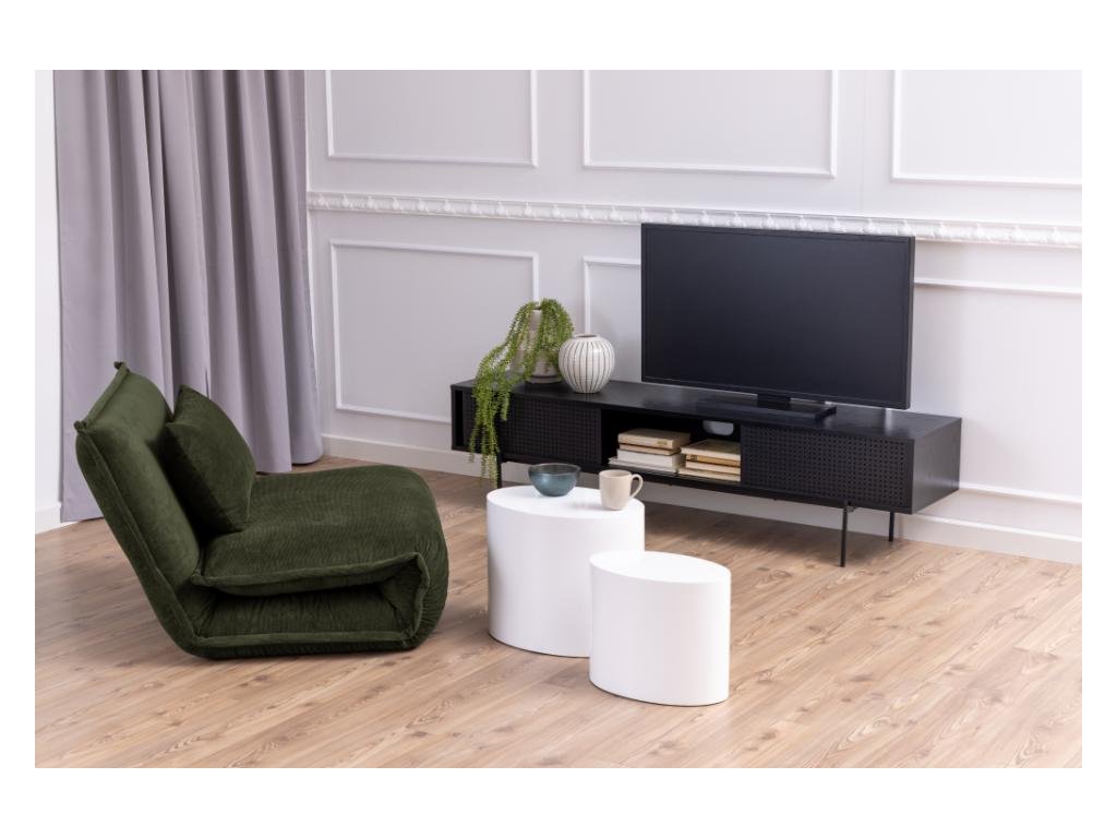 TV stolek Angus v černé barvě kombinuje industriální vzhled s funkčností. Díky posuvným dvířkům, otevřeným přihrádkám a síťkovanému designu nabízí dostatek úložného prostoru i výrazný vizuální prvek do moderního interiéru.