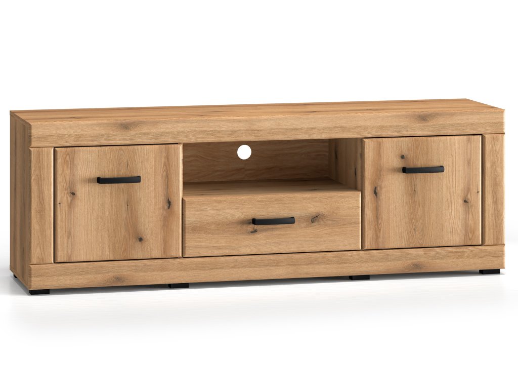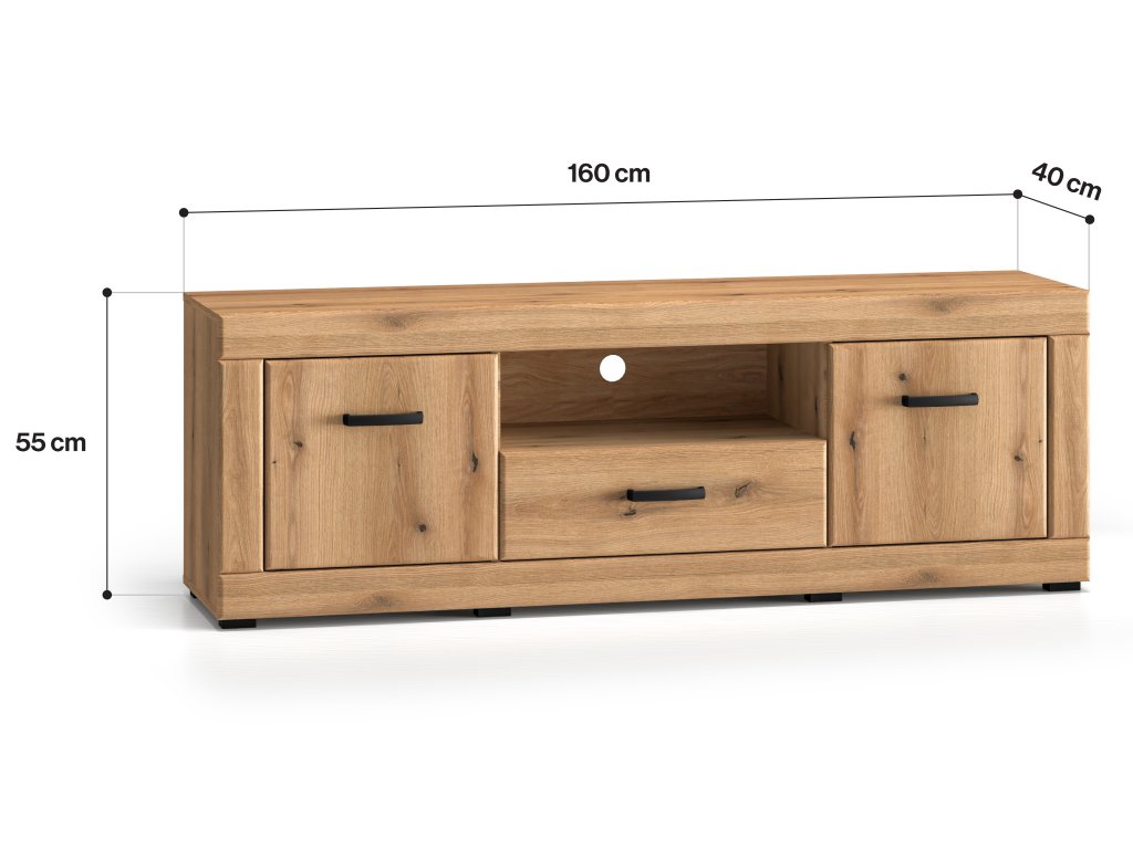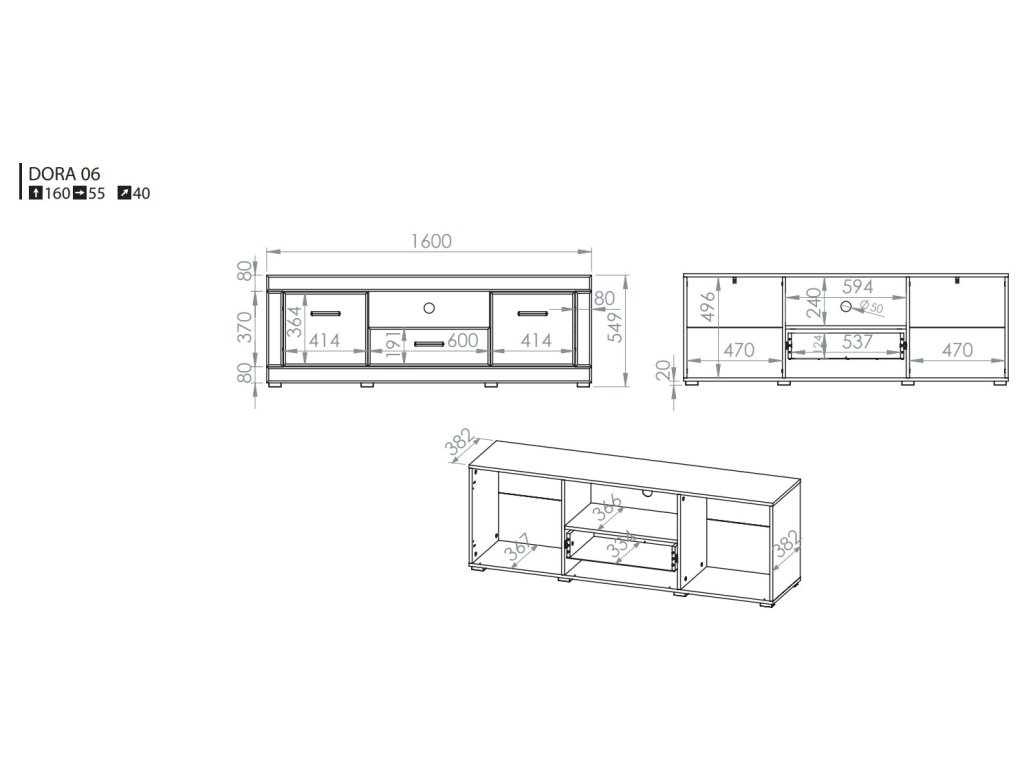 TV stolek Dora 06 je praktickým a elegantním řešením pro obývací pokoj. Na rozměrech 160 × 40 × 55 cm nabízí dvě skříňky s dvířky a jednu zásuvku, které poskytují dostatek místa pro multimediální zařízení, ovladače či další doplňky. Horní deska je prostorná a bez problémů unese i větší televizor.