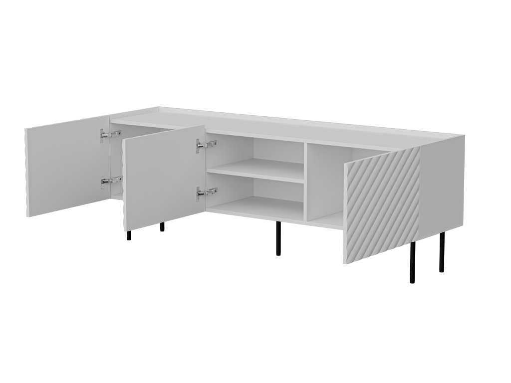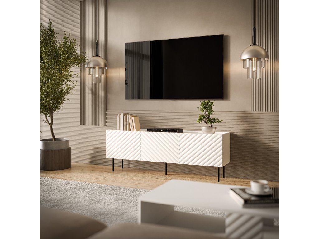 TV stolek Lucia 165 v bílé barvě působí snadno a vzdušně. Je ideální pro menší obývací pokoj, kde zároveň nabízí dostatek úložného prostoru. Kombinuje styl, praktičnost a čistý design. Bílá barva krásně zvýrazní reliéfní diagonální linie čel.
