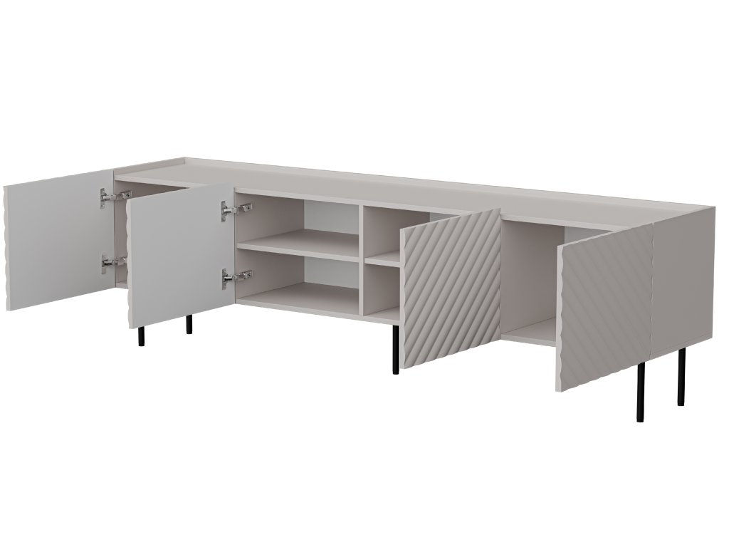 TV stolek Lucia 200 v béžovém provedení dodá obývacímu pokoji teplo a útulnost. Stylová frézovaná čela a jemný odstín vytvářejí harmonický celek. Praktický úložný prostor ukrytý za čtyřmi dvířky pomůže udržet pořádek. Vhodný do přírodně laděných nebo neutrálních interiérů.