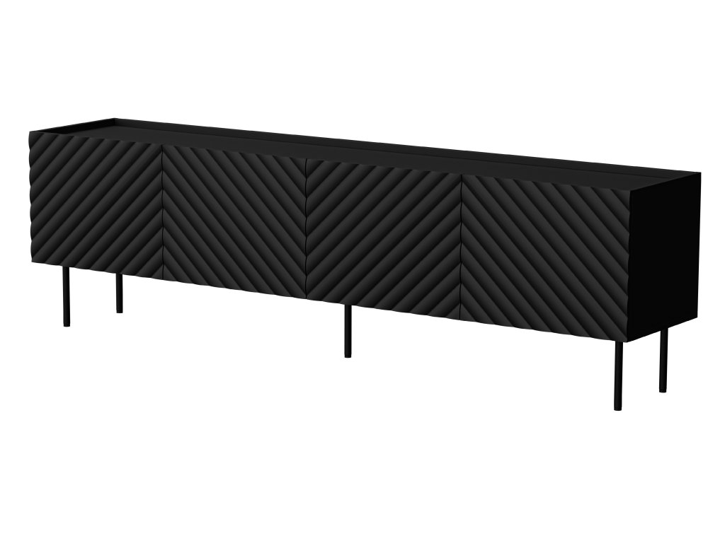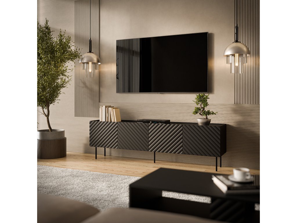 Černý TV stolek Lucia 200 vyniká elegantním, kontrastním vzhledem a stane se dominantou každého obývacího pokoje. Strukturovaná čela s diagonálním frézováním působí moderně a výrazně. Vysoké nožičky usnadní čištění i manipulaci. Ideální pro milovníky odvážného designu.