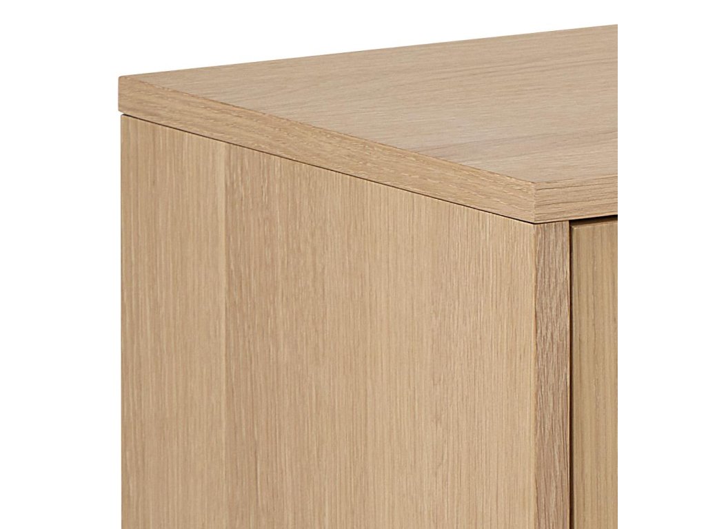 Úložný prostor je prakticky rozdělen na otevřenou část, kde jsou 3 nastavitelné police, a uzavřenou část ukrytou za 2 dvířky, které poskytují místo pro drobnosti. Součástí je také otvor na kabely, který umožňuje udržet prostor upravený a bez nepořádku. Pevné šikmé nohy podtrhují severský styl a dodávají stolku stabilitu i vizuální snadný vzhled.