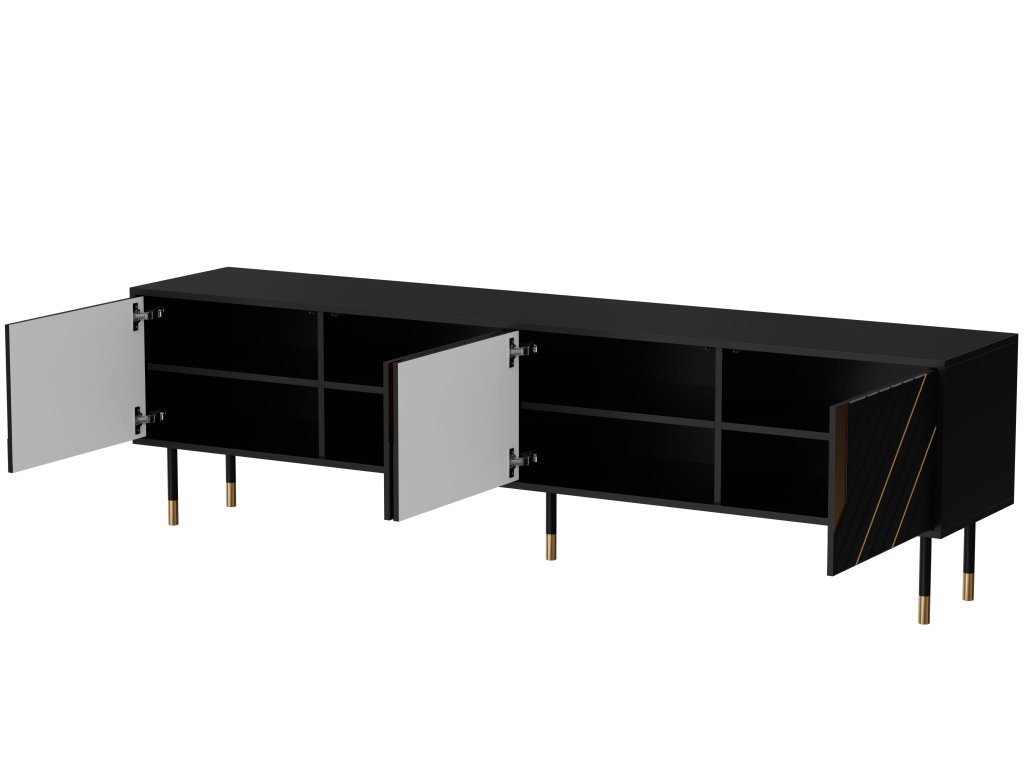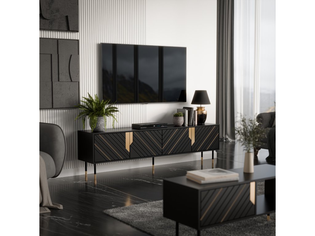 Tento prostorný TV stolek o šířce 200 cm nabízí čtyři samostatné úložné prostory ukryté za černými matnými dvířky se šikmým frézováním. Díky bezúchytkovému systému PUSH TO OPEN působí nábytek čistě, moderně a zároveň umožňuje pohodlné každodenní používání. Zlaté detaily a vysoké kovové nohy v černo-zlaté kombinaci z něj dělají elegantní středobod obývacího pokoje. Ideální pro každého, kdo hledá funkčnost bez kompromisů ve stylu.