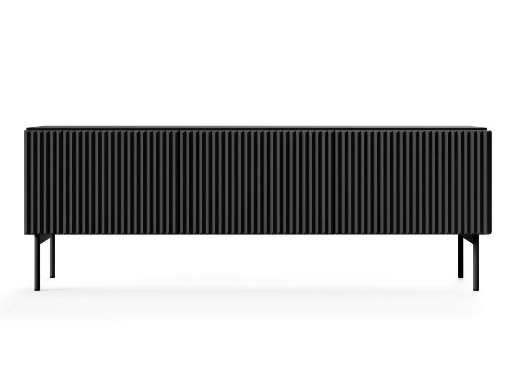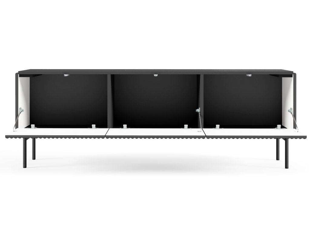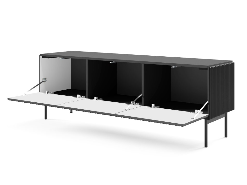 TV stolek Muti F v černé barvě má tři vyklápěcí dvířka, která se otevírají lehkým zatlačením díky push-to-open mechanismu. Rýhovaná čela a boky z MDF mu dodávají výrazný vzhled bez zbytečných detailů. Matný černý dekor a kovové nožičky podtrhují moderní charakter. Ideální pro ty, kteří chtějí mít pod televizorem pořádek a design v jednom.