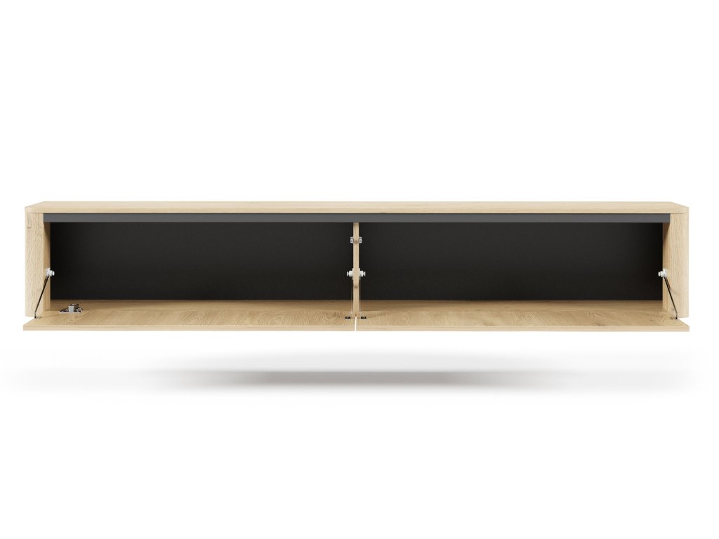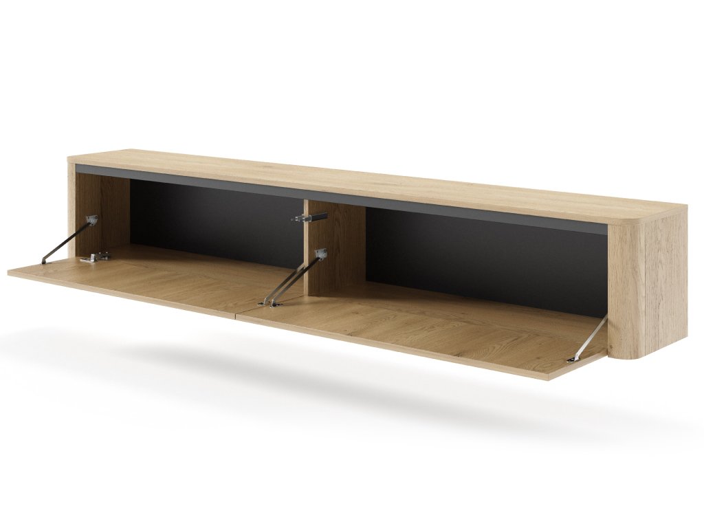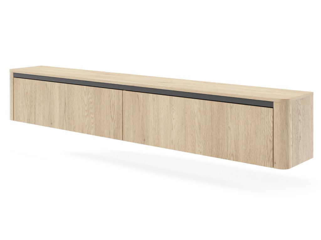 TV stolek Toros F je moderní, závěsný model navržený pro ty, kteří upřednostňují vzdušný, čistý design bez vizuální obtíže. Skládá se z dvou výklopných dvířek, které ukrývají praktický prostor pro techniku a vše potřebné, co chcete mít uschované, ale stále po ruce. Díky push-to-open systému působí čelní řešení jednoduše a nerušivě, bez úchytek. Dekor dub krémový v kombinaci s černými zaoblenými bočními MDF lištami a horní ozdobnou černou lištou vytváří kontrastní, elegantní celek – stolek tak působí moderně, ale zároveň teplo a nadčasově.
