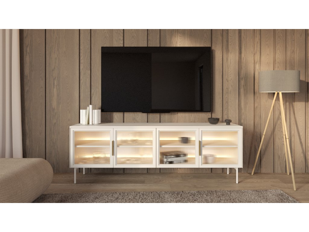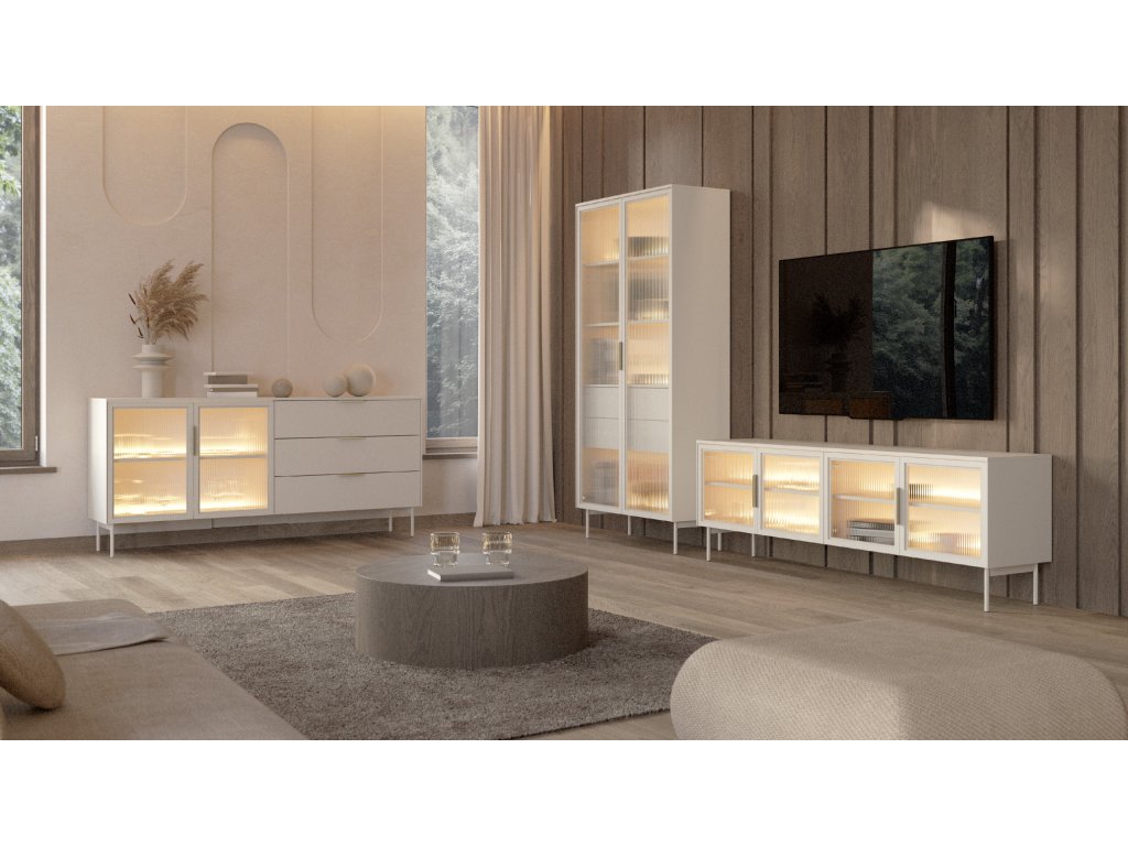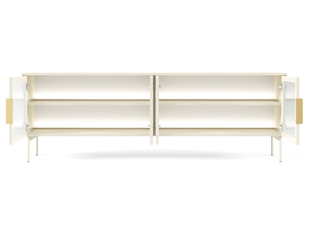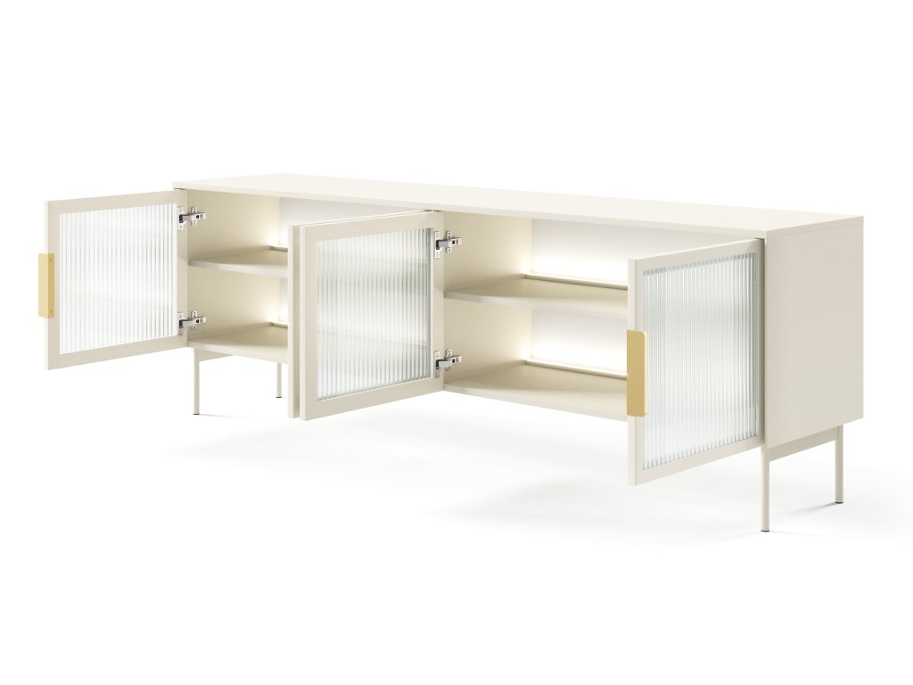 TV stolek Lumus D v jemném odstínu béžové kašmírové barvě&je navržen tak, aby spojoval moderní vzhled, praktický úložný prostor a příjemnou atmosféru. Stolek je uzavřen dvířky s tvrzeným sklem, za kterými se ukrývá místo pro multimediální zařízení nebo dekorace. Vnitřek je osvětlen LED profilem s neutrálním bílým světlem, které zvýrazní obsah bez oslňování, což zajistí pořádek a vizuální čistotu v obýváku.