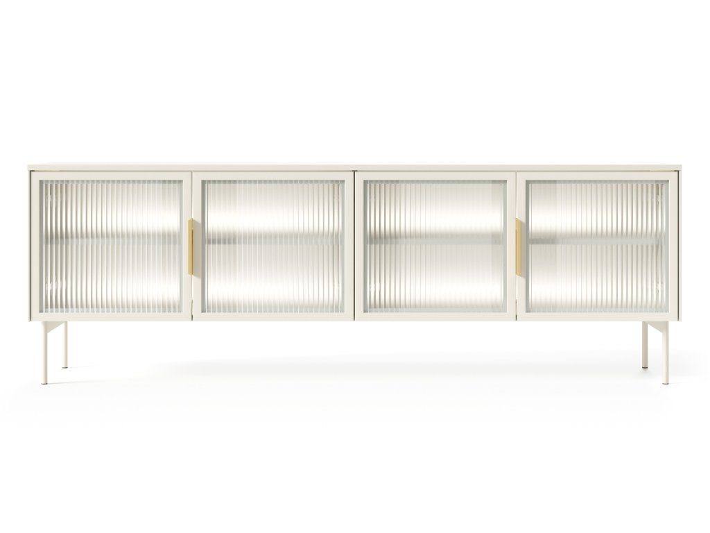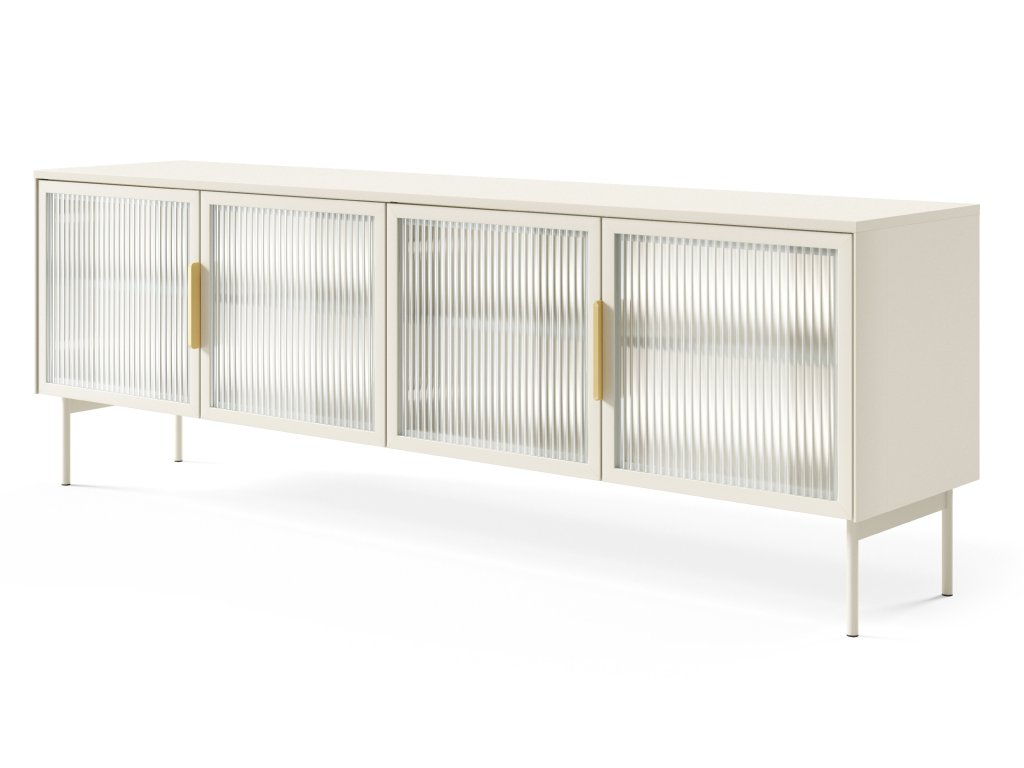 Kolekce Lumus staví na luxusní kombinaci materiálů – laminovaná deska a rámová dvířka z MDF, doplněná o ornamentálně tvrzené sklo s jemným reliéfem. Vše je promyšleně sladěno v odstínu béžové kašmírové barvy, který působí nadčasově a uklidňujícím dojmem. Detaily jako zlaté kovové úchytky, metalické nožičky, kvalitní ABS hrany, plnovýsuvné zásuvky a decentní LED osvětlení dělají z kolekce ideální volbu pro elegantní a funkční bydlení. TV stolek Lumus je ukázkou toho, jak lze spojit styl, praktičnost a jemnost v jednom kuse nábytku.