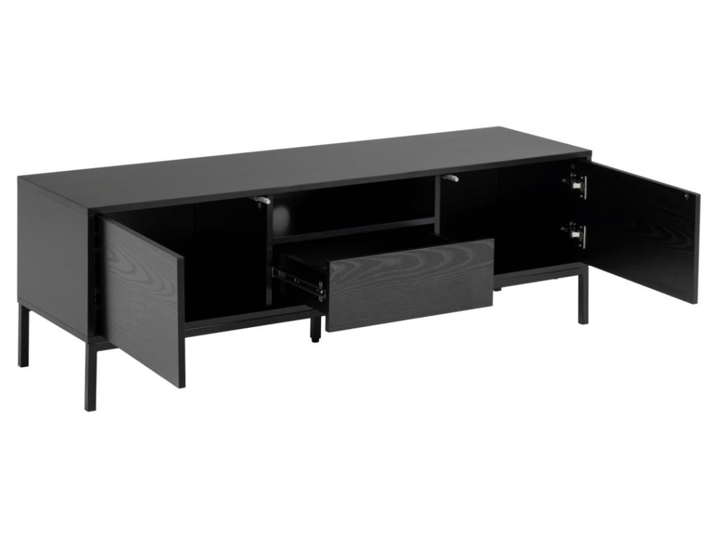 TV stolek Seaford spojuje matné černé povrchy a kovové detaily s funkčním řešením úložného prostoru. Zásuvky, dvířka i otevřená přihrádka nabízí spoustu místa. Ideální doplněk k modernímu interiéru.