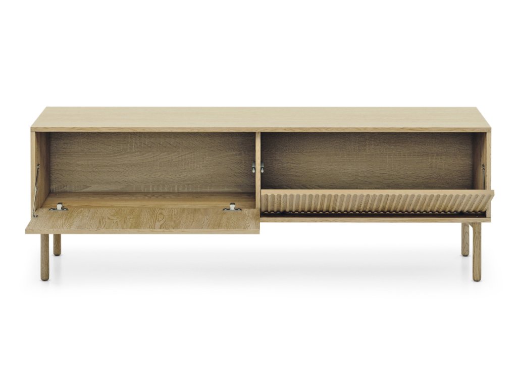 TV stolek Tavo D nabízí tři zásuvky s bezúchytkovým otevíráním push-to-open a jemně frézovanými čely. Dekor dub krémový a vnitřek v dub sonoma vytváří teplý a příjemný kontrast. Dřevěné nožičky dodávají stolku lehkost i stabilitu. Ideální řešení pod televizor do moderně a přirozeně laděného obývacího pokoje.