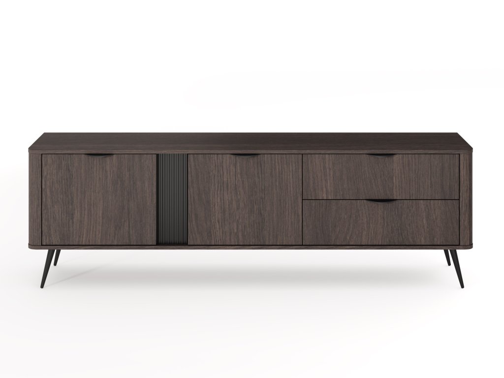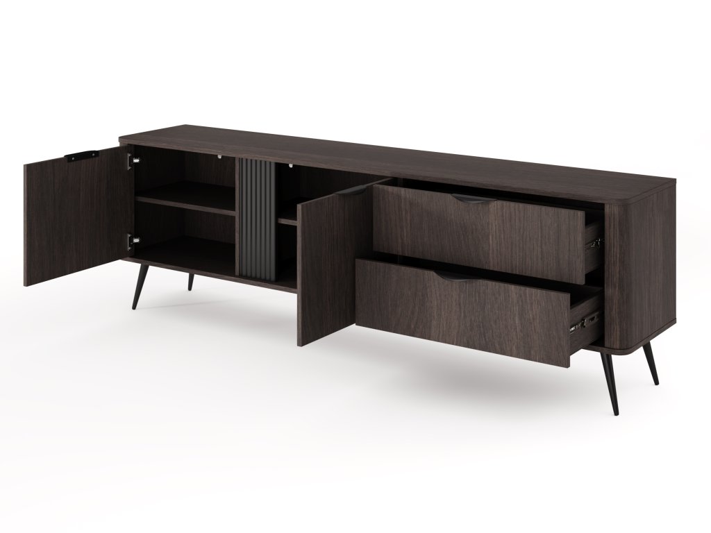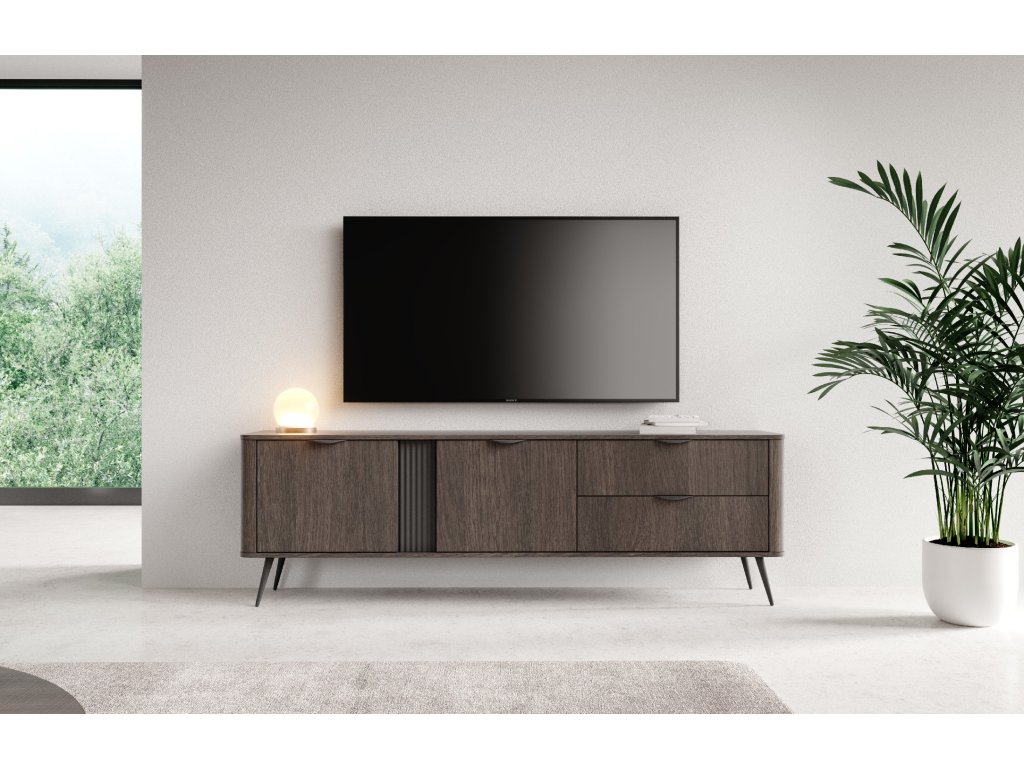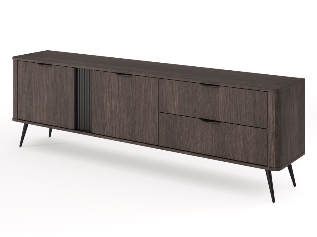 TV stolek Veris E je promyšleně navržený kus nábytku, který nabízí funkčnost bez kompromisů na stylu. Jeho vnitřní rozložení je rozděleno napůl – jedna polovina patří skříňce s dvířky a policí, druhá je vybavena dvěmi prostornými zásuvkami pod sebou, ideálními pro uložení elektroniky, ovladačů či doplňků. Tmavý dubový dekor působí sofistikovaně a hřejivě, zatímco rýhovaná černá lišta, zaoblené boční MDF prvky, černé kovové nožičky a kovové úchytky vytvářejí výraz. Stylové úchyty plní praktickou i designovou funkci.