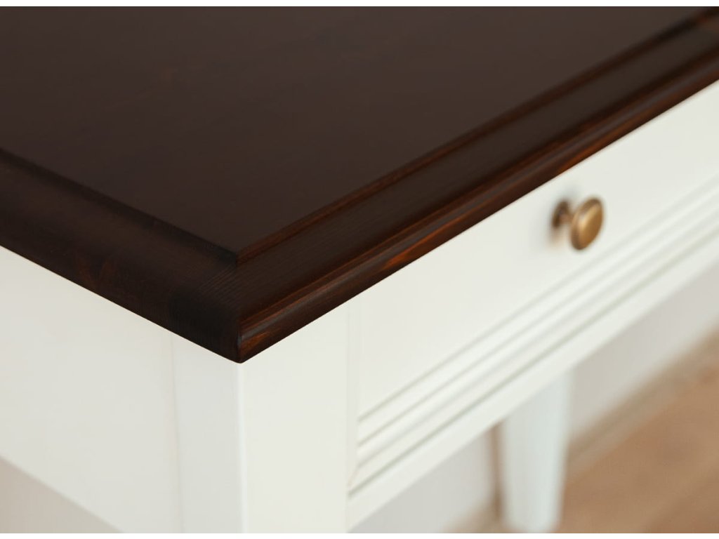 Toaletní stolek Bellu z borovice byl vyroben z masivu nejvyšší kvality. Přírodní materiál finské borovice je zárukou trvanlivosti a odolnosti vůči poškození. Bílý dřevěný toaletní stolek je natřený ekologickou barvou na vodní bázi v odstínu krémové, teplé bílé barvy. Tato barva dodává interiéru útulnost. Nábytek vypadá skvěle oproti pastelovým i kontrastnějším stěnám. Vrchní deska je v odstínu ořech.