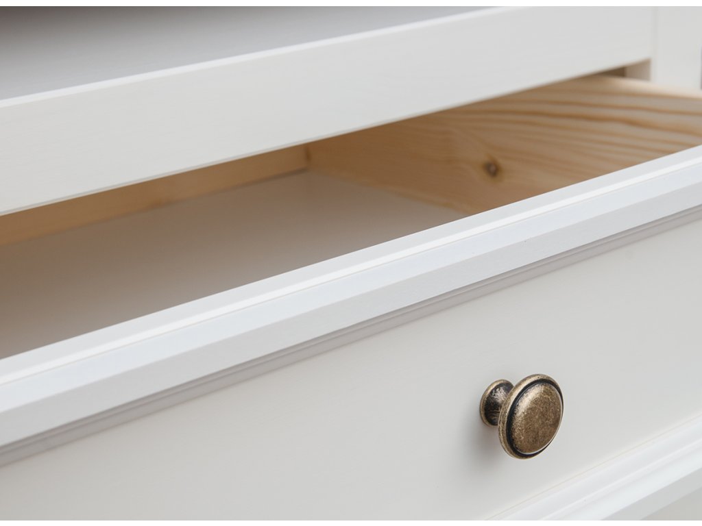 Korpus a vrchní část toaletního stolku zdobí jemné zářezy, které zvýrazňují provensálský charakter nábytku. Charakteristickým znakem stolku jsou také jemně vyřezávané nohy. Díky zúženému spodku dodávají toaletnímu stolku lehkost. Nábytek však neztrácí svoji stabilitu. Provensálský styl nábytku zvýrazňují také oblé, kovové úchytky v odstínu starého stříbra. Jsou ozdobou zásuvky, která bude fungovat jako roztomilá a praktická skrýš pro veškerou vaši kosmetiku a šperky.