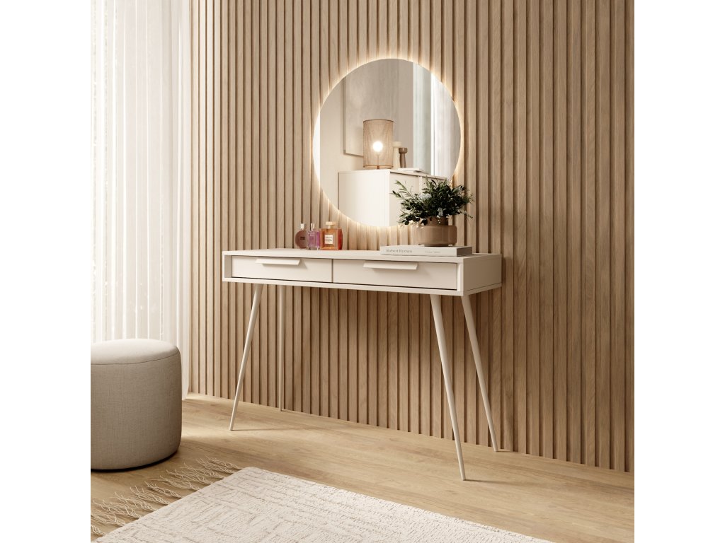 Toaletný stolík je vybavený dvomi zásuvkami, ktoré poskytujú praktický úložný priestor na kozmetiku a doplnky. Vyhotovený je v odtieni béžová (kašmír) s dôrazom na čistý a moderný dizajn. Zásuvky majú kovové úchyty pre jednoduché otváranie a stabilitu zabezpečujú kovové nohy v rovnakom farebnom prevedení.