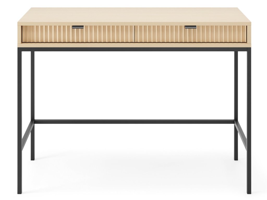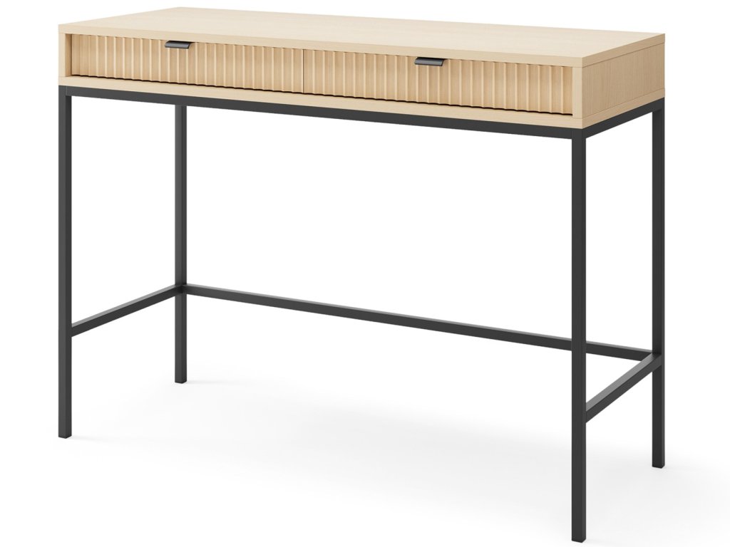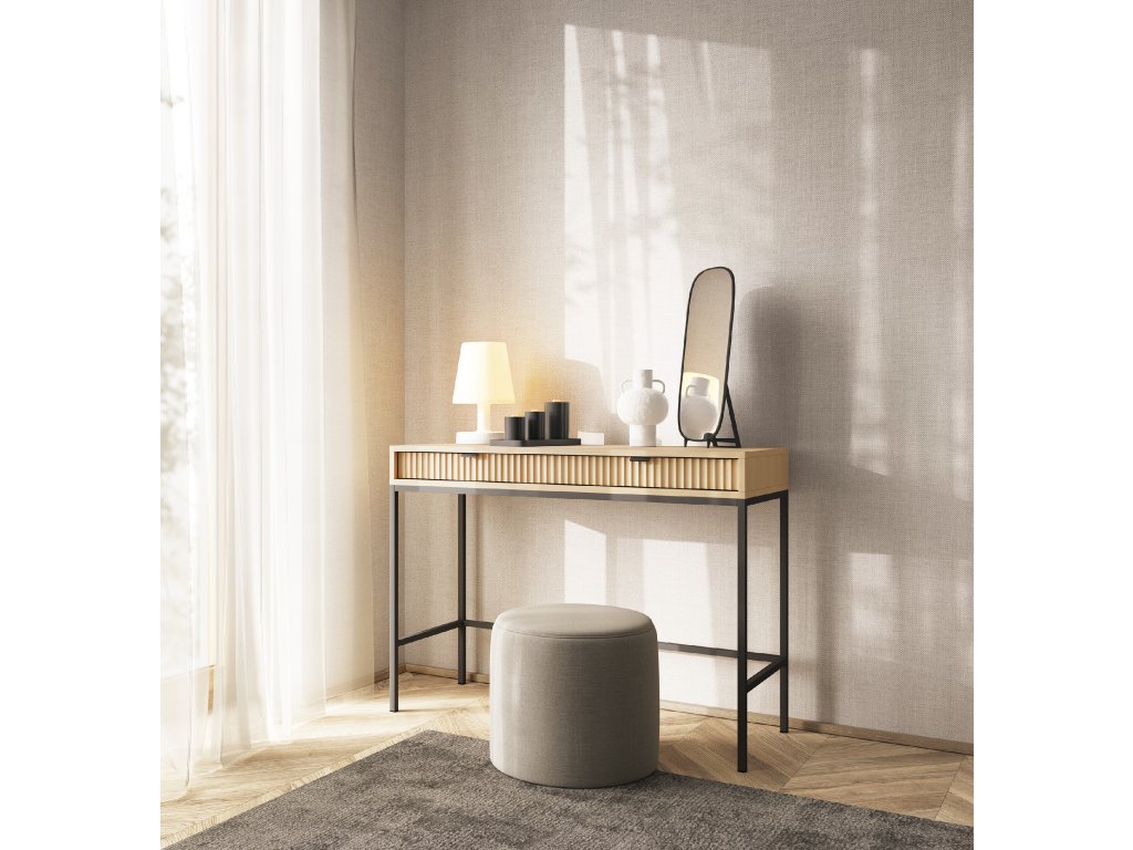 Kosmetický stolek Novas v dekoru dub vincenze je moderním a elegantním doplňkem, který vytvoří dokonalý prostor pro každodenní beauty ritual. Drážkovaná MDF čela se stylovými černými hliníkovými úchyty působí luxusně, zatímco černá kovová podstava dodává stolku vzdušnost a stabilitu. Korpus z odolné laminované desky a ABS hrany zajišťují dlouhou životnost. Ideální do moderní ložnice.