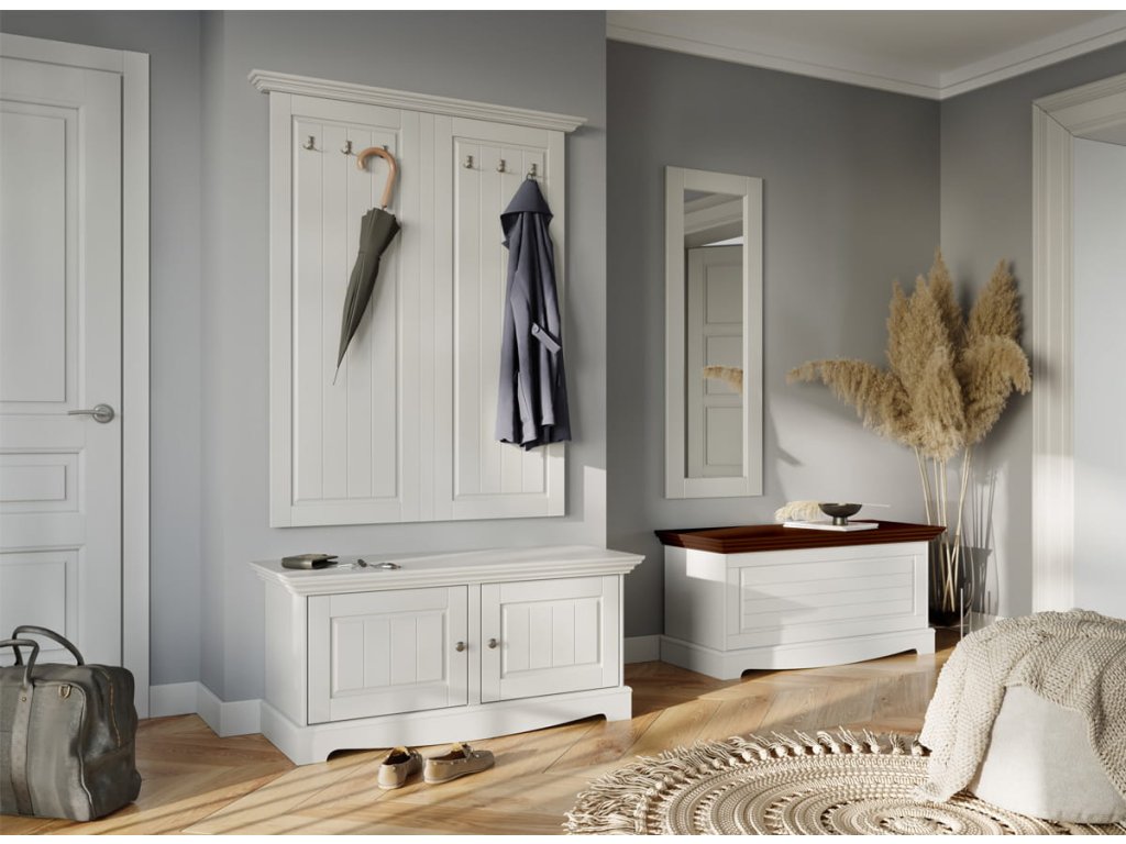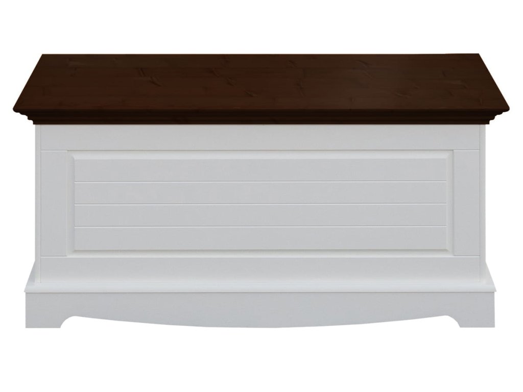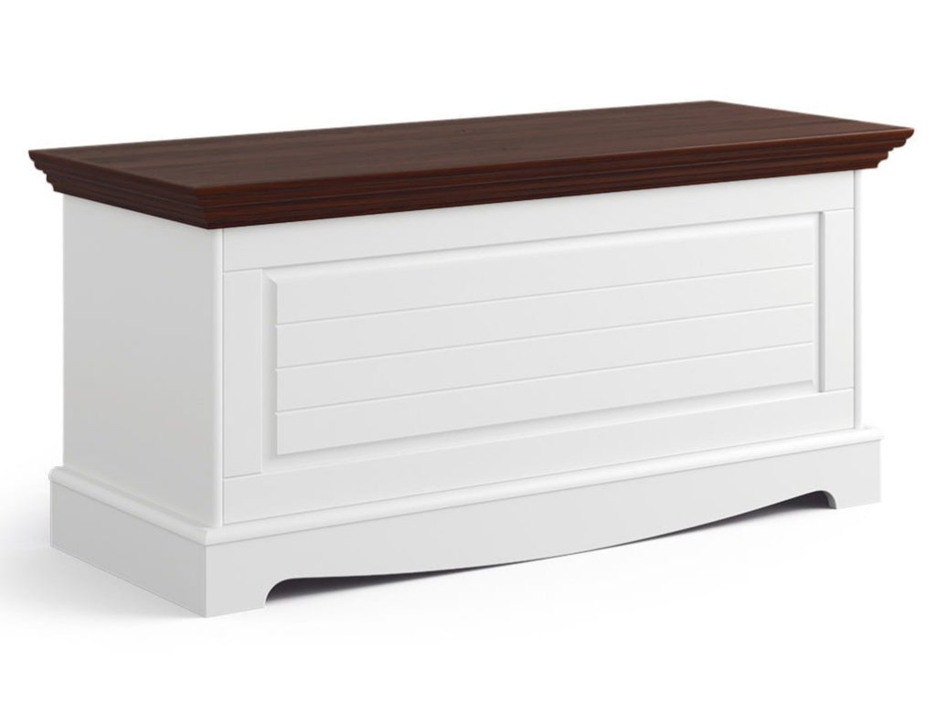Bílá úložná truhla s vrchem v barvě ořech se perfektně hodí k dalšímu nábytku. Víko nábytku je zdobeno elegantním frézováním, která zdůrazňuje klasický charakter těla. Truhla stojí na jemně vyřezávaném podstavci, který opticky zeštíhluje celou strukturu a dodává jí lehkost. Přední část boxu zdobí také jemné frézování. Její přítomnost činí siluetu nábytku jemnější a linie hladšími.