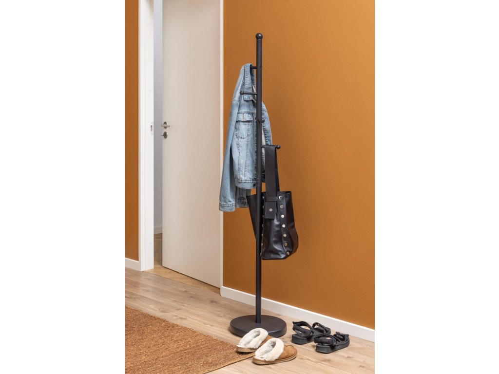 Věšák Aspan je praktickým řešením pro moderní interiéry. Díky černé kovové konstrukci s asymetrickým designem působí nadčasově a zároveň elegantně. Ideální doplněk do předsíně nebo šatníku.
