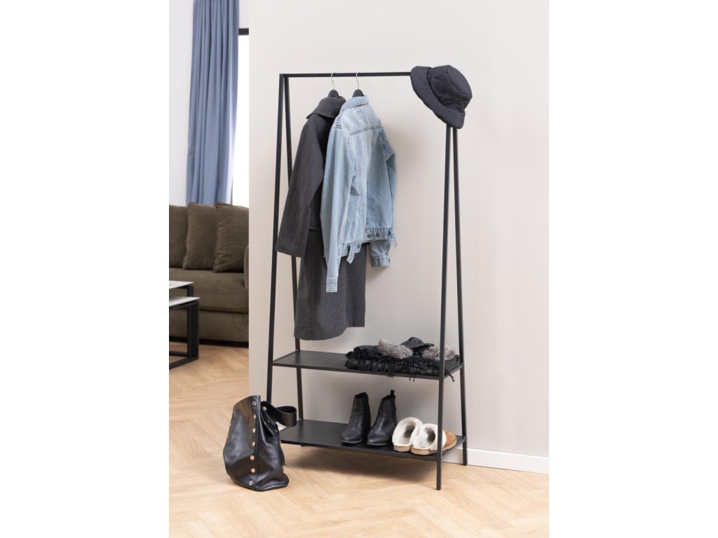 Otevřená konstrukce působí vzdušně, šetří prostor a pomáhá oblečení volně dýchat. Plastové krytky na nohou chrání podlahu před škrábanci, zatímco odolný melaminový povrch polic stačí přeleštit vlhkým hadříkem. Výsledkem je praktický kus nábytku, který se hodí rovněž do moderního loftu, minimalismu i eklektického interiéru.