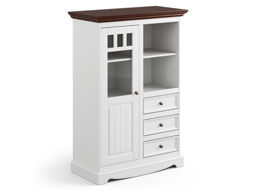 Představujeme klasickou vitrínu do obývacího pokoje s prosklenými dvířky. Je mimořádně prostorná a kromě krásného vzhledu poskytuje také vysokou funkčnost. Má frézované zásuvky, otevřené police a prosklené police. Bílá vitrína byla vyrobena z nejkvalitnějšího finského borovicového dřeva.